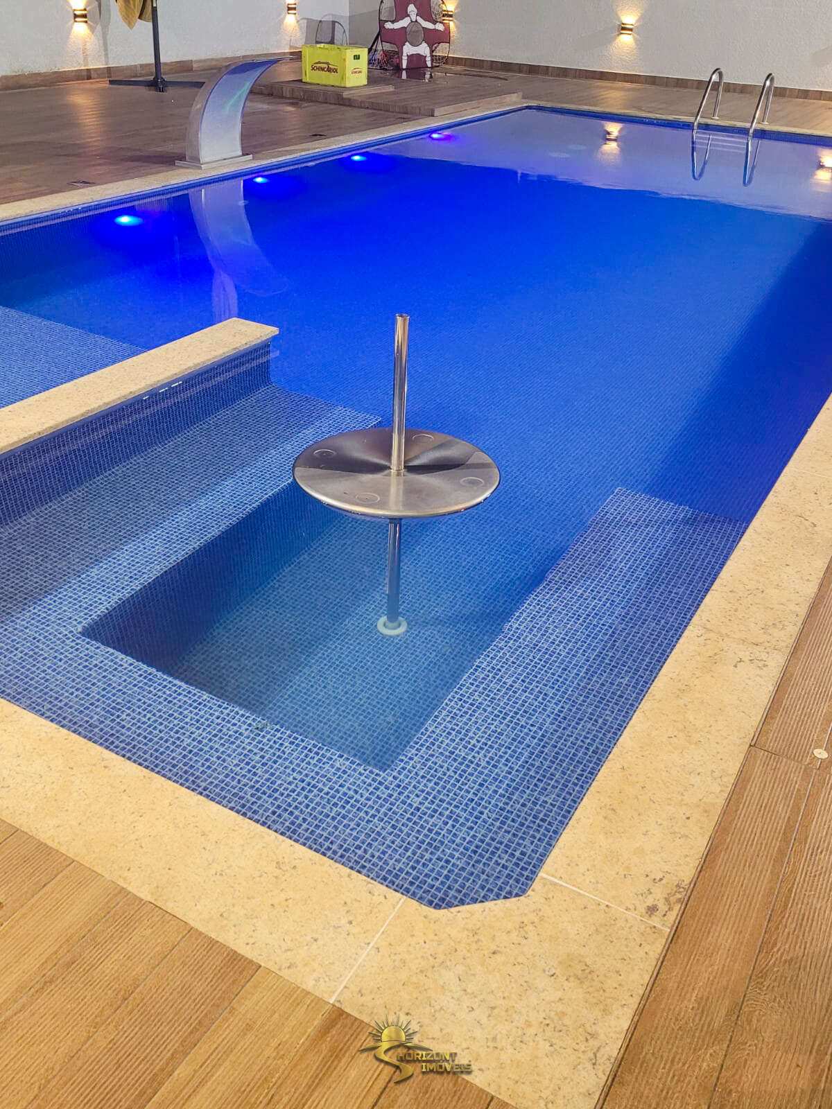 Piscina aquecida com 50 mil litros, hidromassagem, cascata, prainha para crianças, bar molhado e ducha.