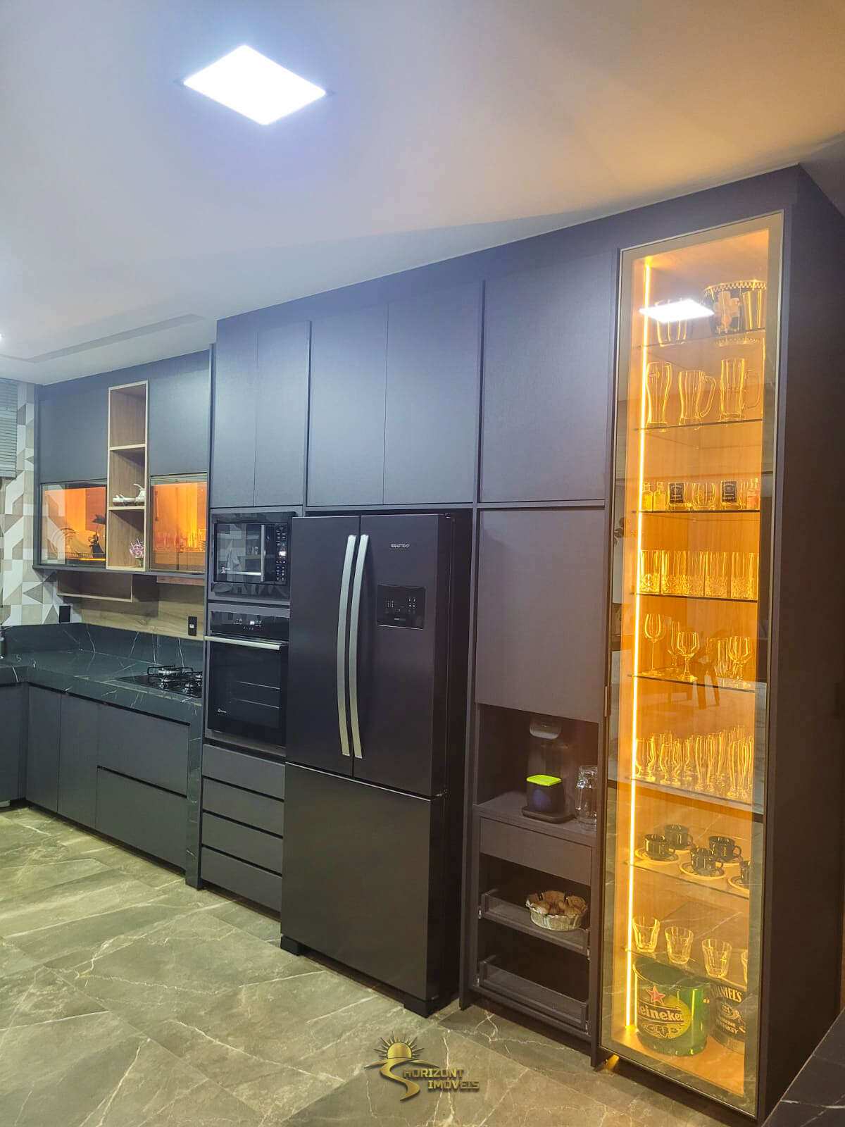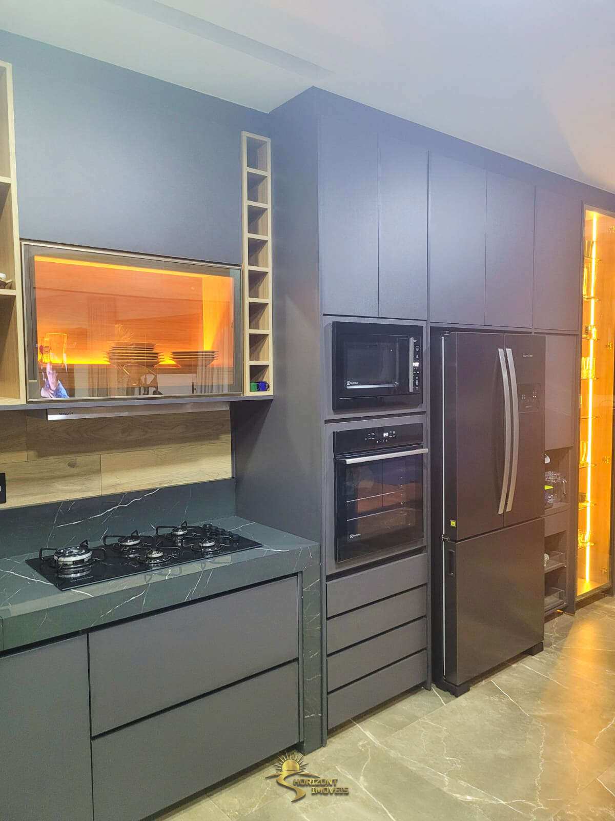 Cozinha: 54 m², toda em porcelanato, com armários planejados, integrada à área gourmet.