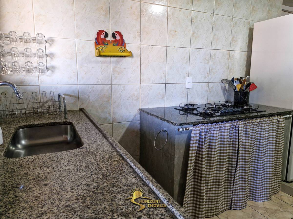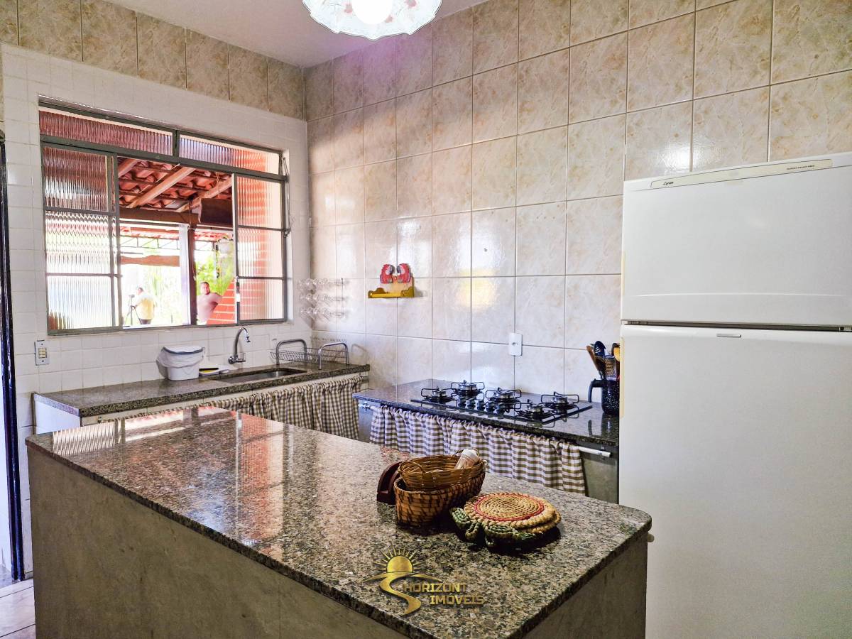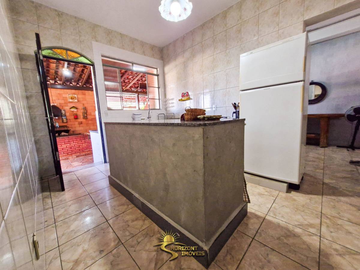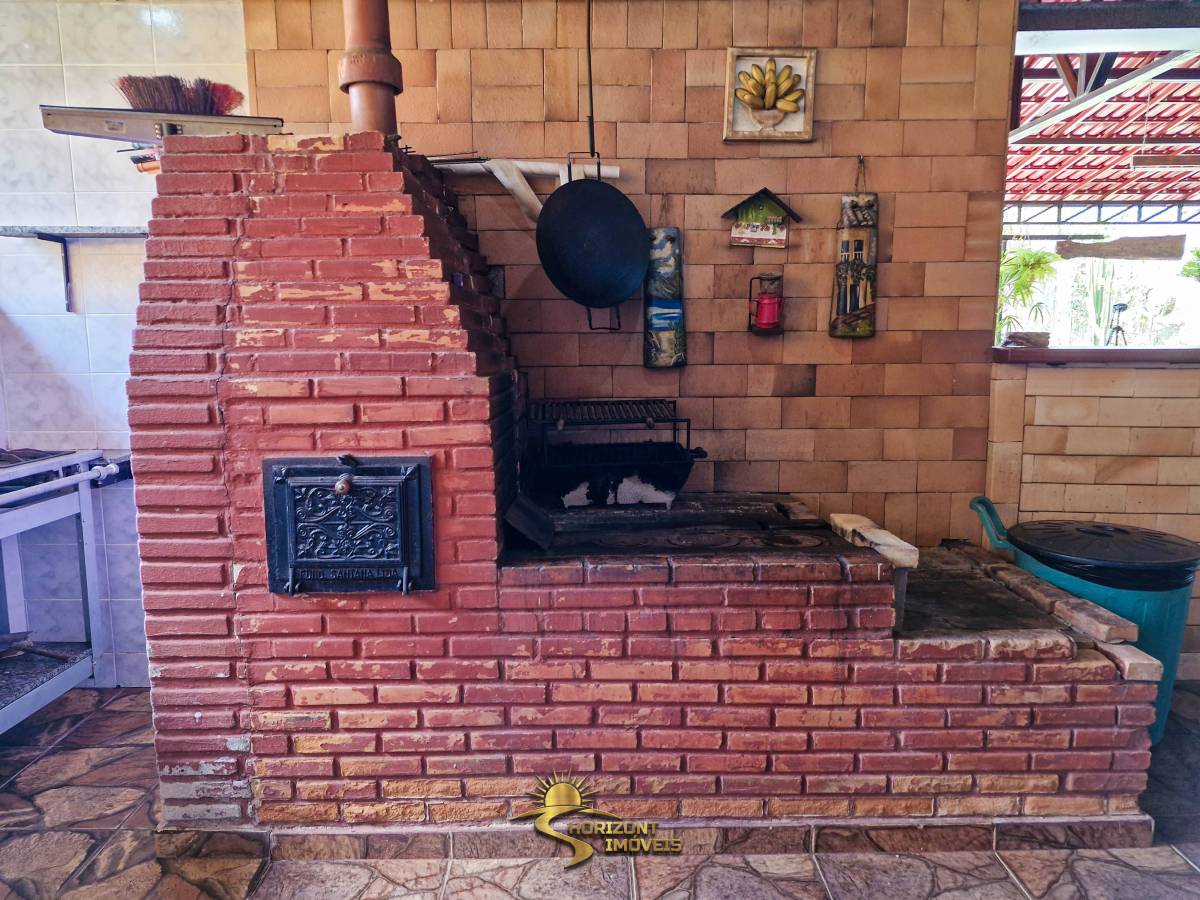 • Área gourmet equipada com churrasqueira, fogão a lenha, duas mesas em granito, fogão semi-industrial externo e pias (interna e externa).